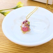 ペンダント上部にルビー、ペリドット、淡水パール、スワロフスキーをワイヤーで編み込みエレガントに仕上がりました。
