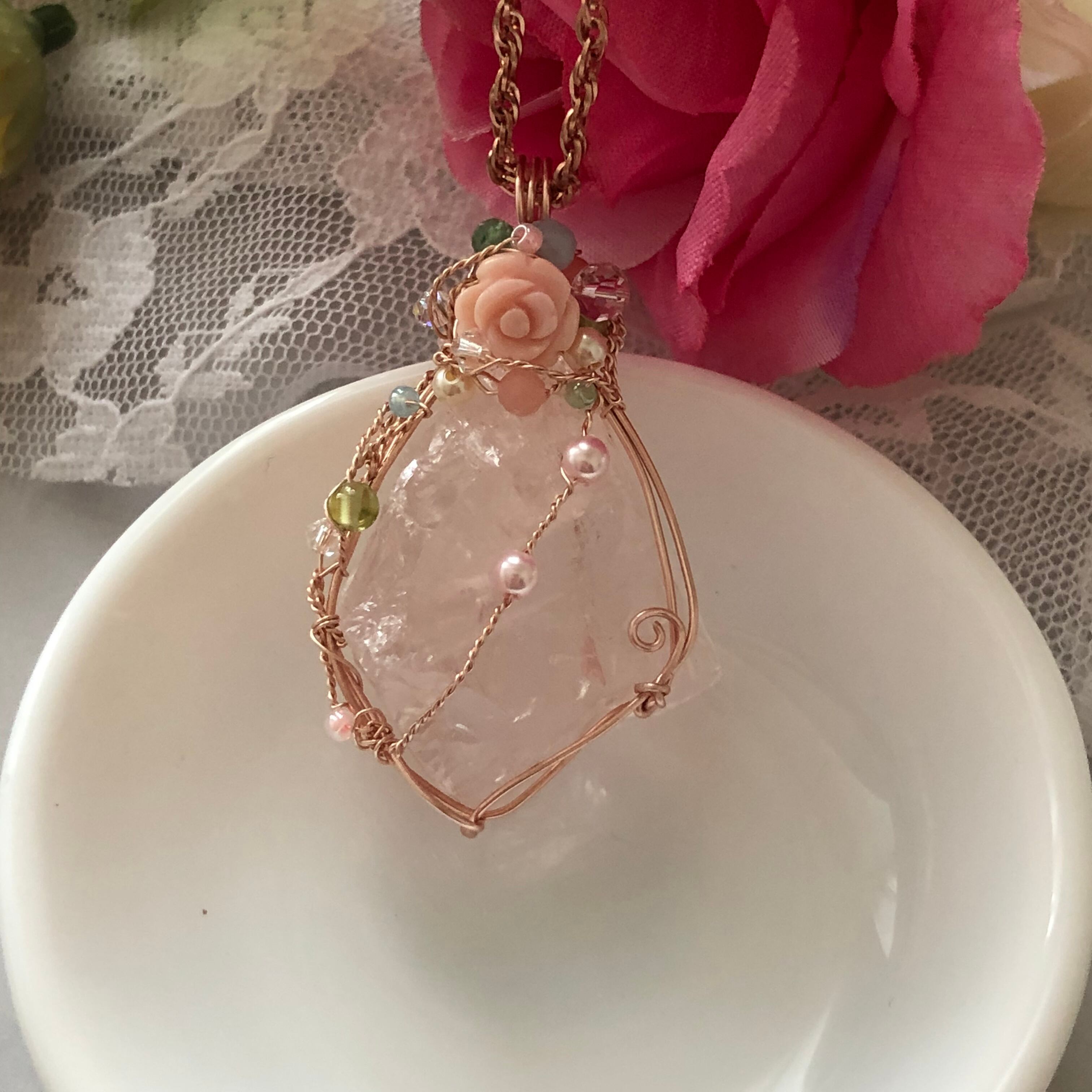 30㎜の原石にクィーンコンクシェルの薔薇、アクアマリン、ペリドットアベンチュリン、クンツァイト、淡水パール、スワロフスキーを添えてワイヤーラッピングしています。